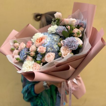 Бархатный цилиндр из голубых диантусов, розовых пионов и ароматной маттиолы