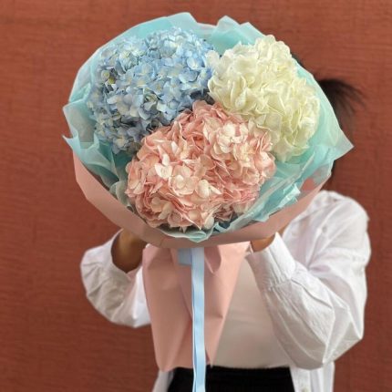 Букет из гортензии, эустомы, роз, диантуса и статицы в стильной упаковке “Балинезия”