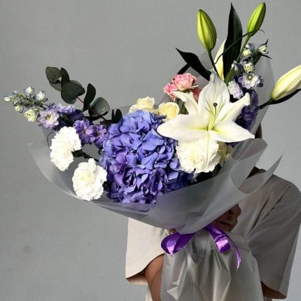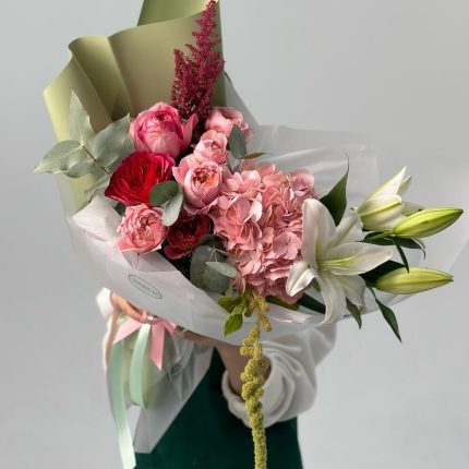 Авторский букет “Окно в сад”: пионовидная лилия, кружевная гвоздика и стойкая альстромерия