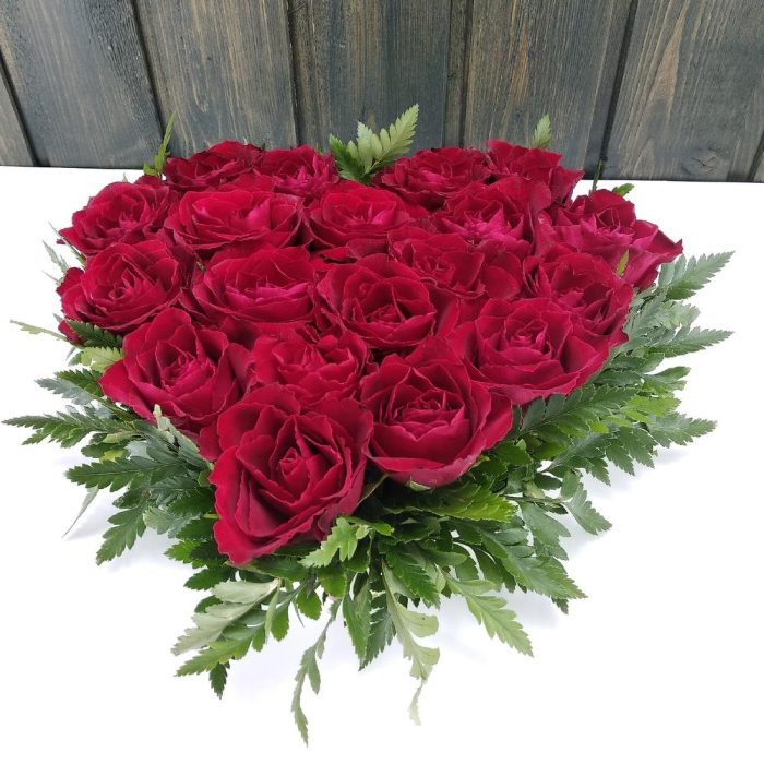 Composition in the form of heart from the single-headed red roses framed with fern. It is not necessary for the vase, because the roses are in floral oasis and get the necessary water out of it