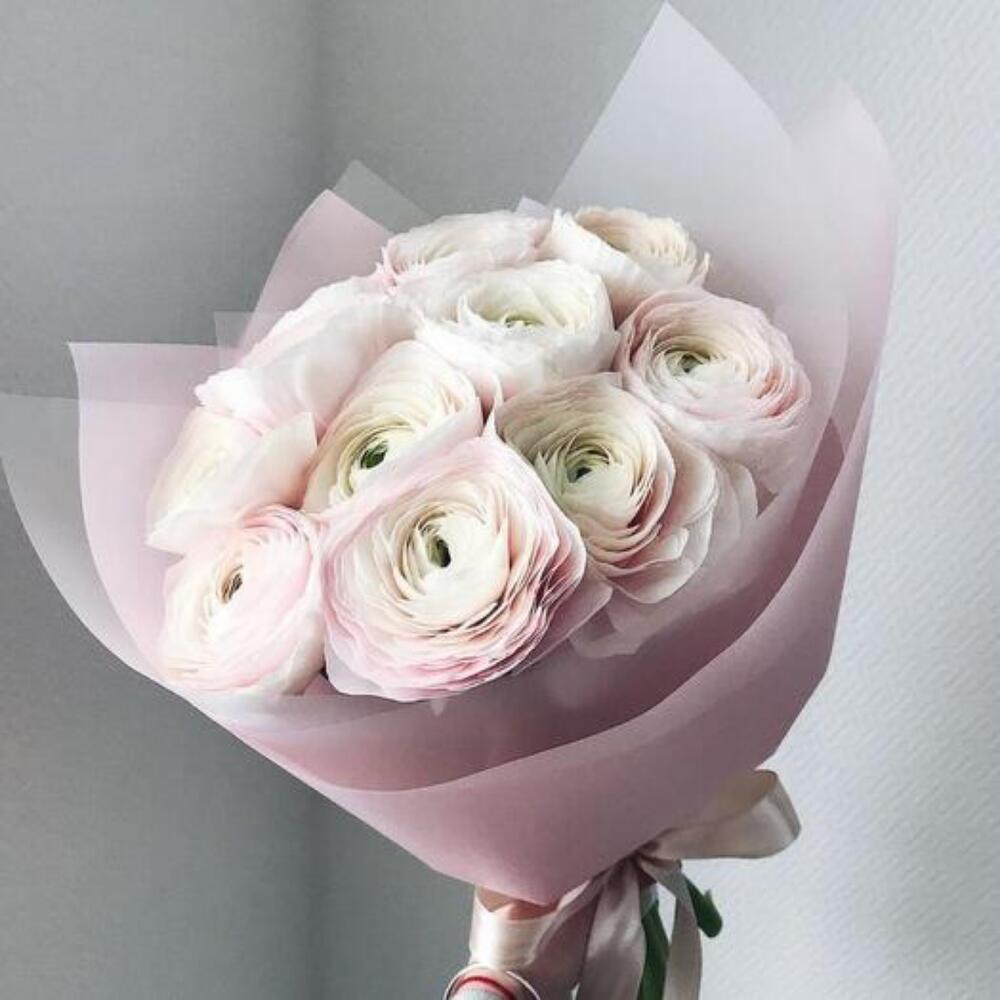 Ранункулюс (белый) – 11 шт.Дизайнерская упаковка – 2 шт.Лента атласная – 1 шт.