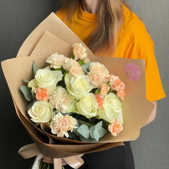 Роза – 5 шт. Упаковка – 1 шт. Диантус – 5 шт. Атласная лента – 1 шт. Диантус кустовой – 3 шт.