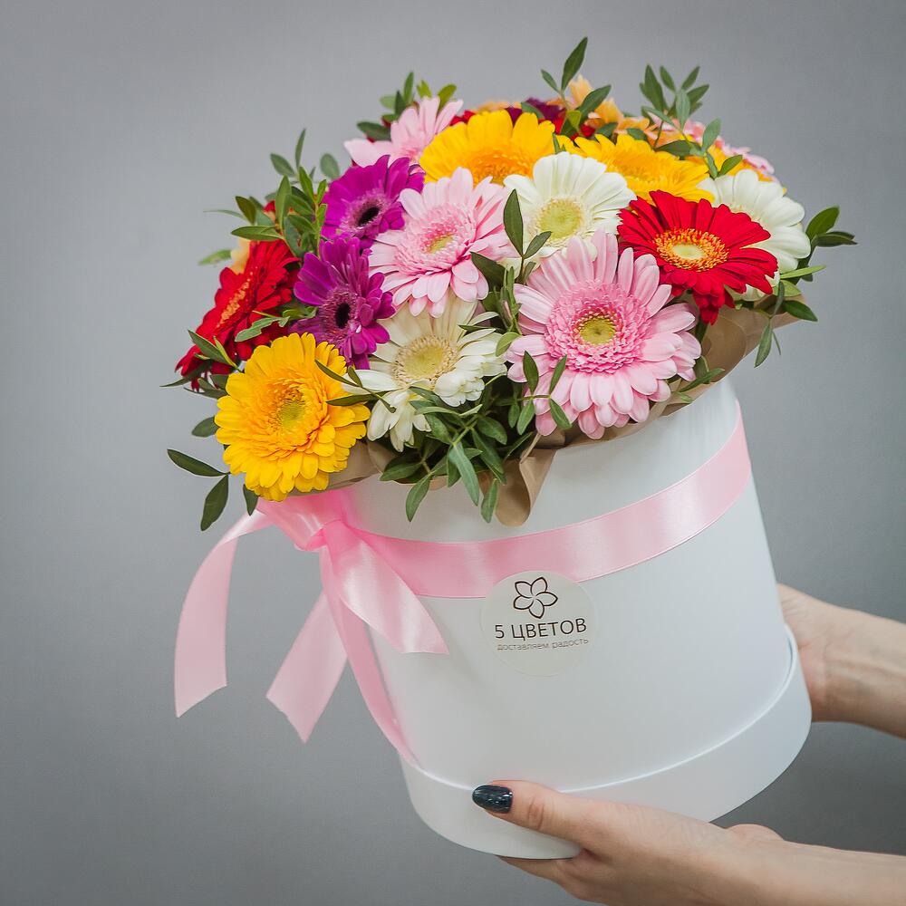 Гербера желтая – 5 шт.Гербера красная – 5 шт.Гербера розовая – 5 шт.Гербера белая – 5 шт.Гербера кремовая – 3 шт.Гербера фиолетовая – 2 шт.