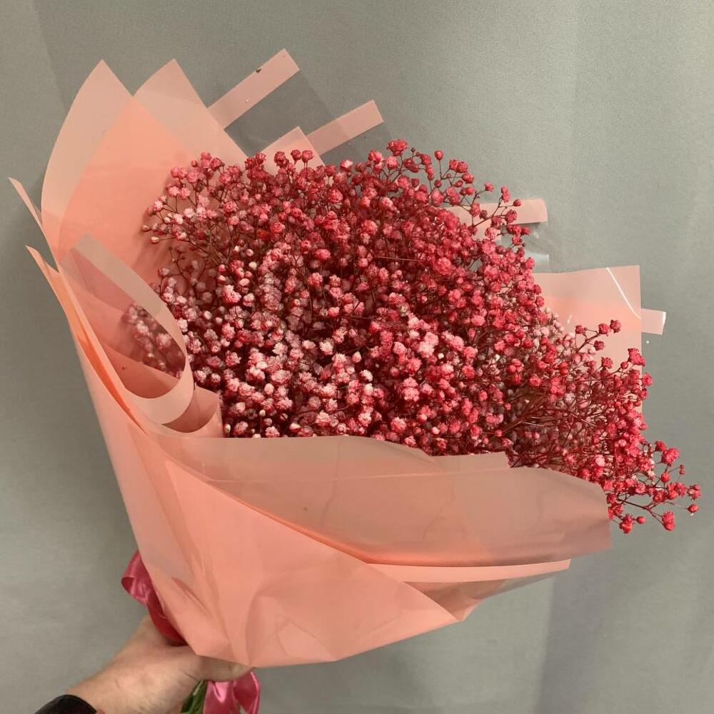 гипсофила окрашенная красная – 7 шт.Корейская пленка – 3 шт.Лента атласная – 1 шт.