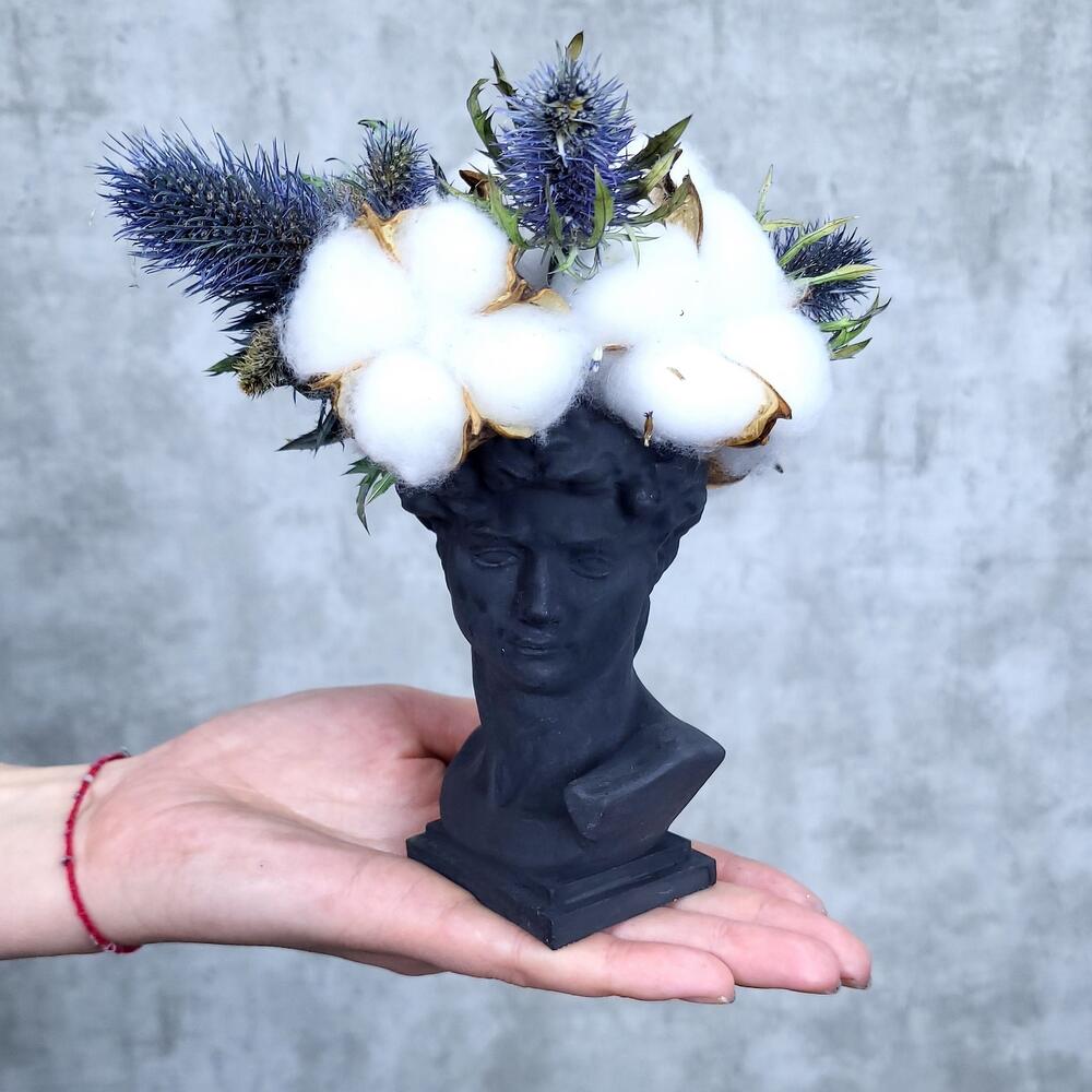 Хлопок – 5 шт.Эрингиум – 4 шт.Оазис флористический – 1 шт.голова из гипсофила – 1 шт.
