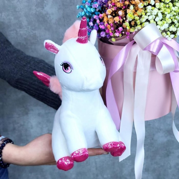 Единорог Лизонька со стаканчиком белоснежной гипсофилы