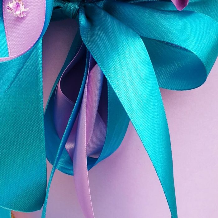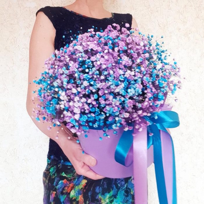Лента атласная – 2 шт.Открыточка с вашими пожеланиями – 1 шт.Оазис флористический – 1 шт.гипсофила радужная – 15 шт.тишью упаковка сиреневая – 1 шт.