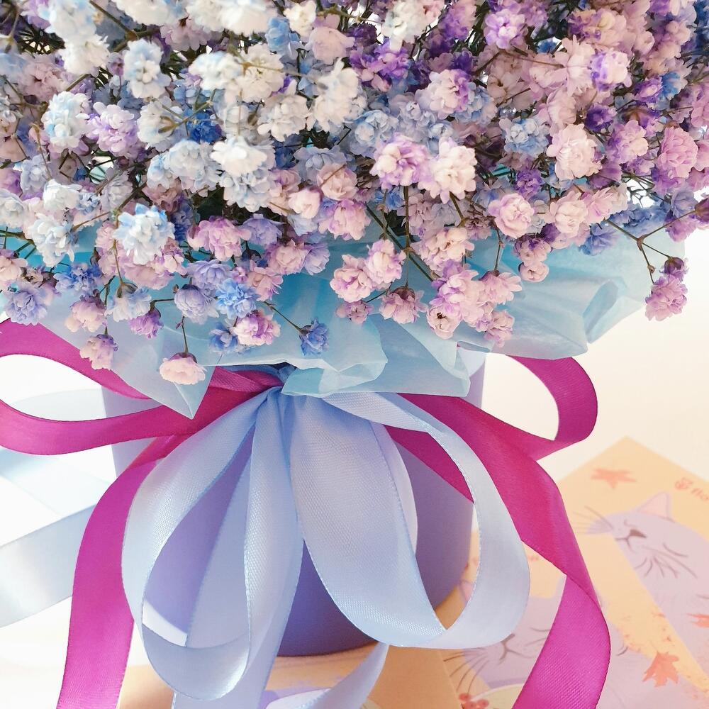 Лента атласная – 2 шт.Коробка шляпная – 1 шт.Открыточка с вашими пожеланиями – 1 шт.Оазис флористический – 1 шт.гипсофила радужная – 7 шт.любовь флориста (бесплатно) – 1 шт.