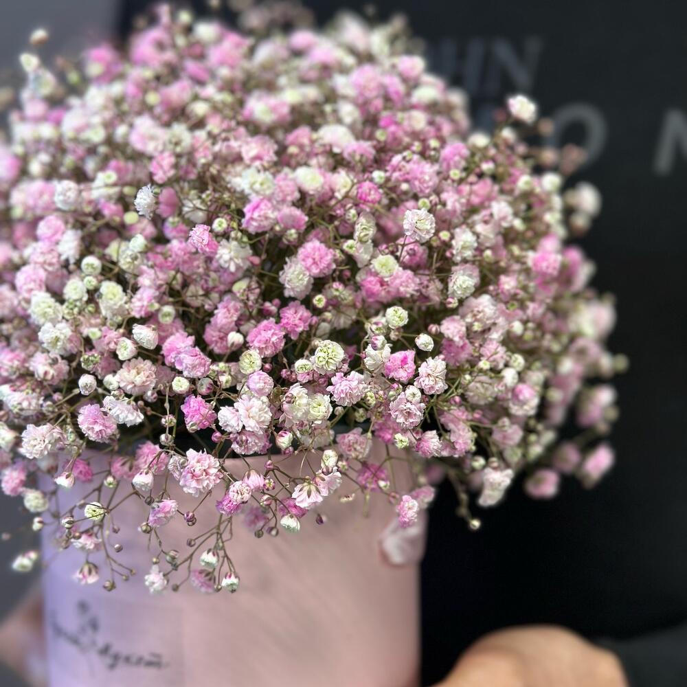“Сиреневый туман” – композиция из гипсофилы в шляпной коробке