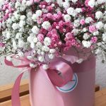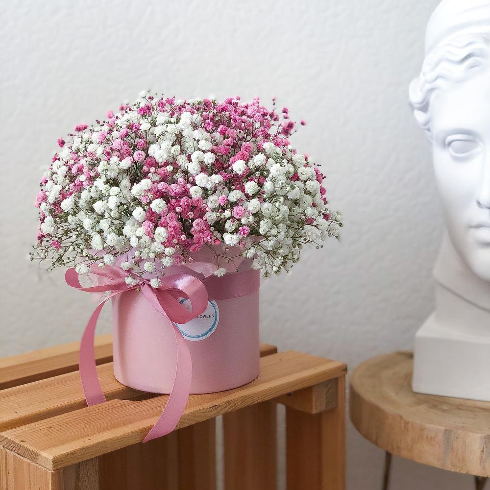 “Сиреневый туман” – композиция из гипсофилы в шляпной коробке