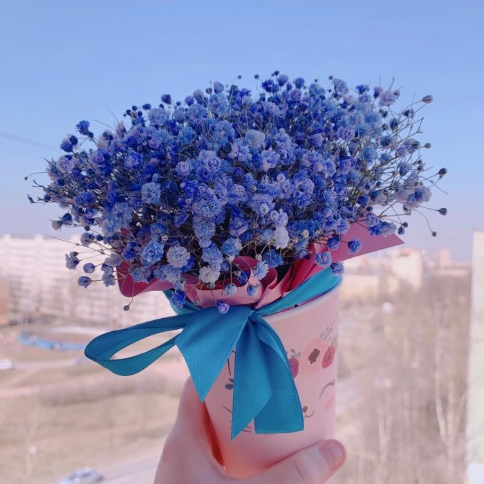 Флористическая губка – 1 шт.Инструкция по уходу – 1 шт.голубая гипсофила – 3 шт.бумажный Стакан – 1 шт.