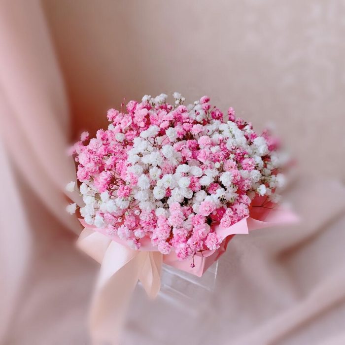 Лента атласная – 1 шт.Флористическая губка – 1 шт.Гипсофила розовая – 2 шт.гипсофила белая – 1 шт.