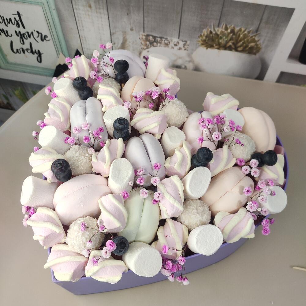 Гипсофила – 1 шт.Зефир – 9 шт.Голубика – 50 шт.Маршмеллоу (пачка) – 1 шт.рафаело – 6 шт.