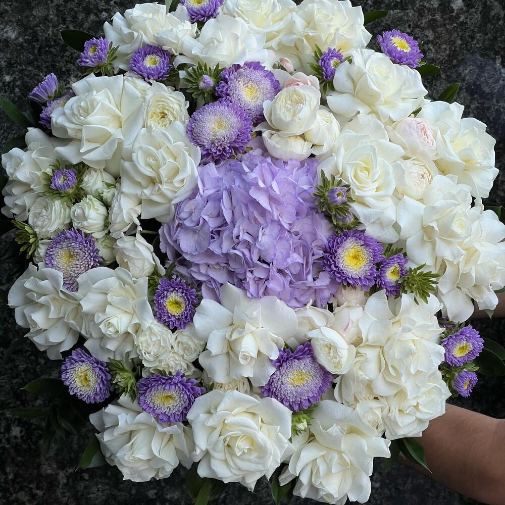 Гортензия сиреневая – 1 шт. Астра кустовая – 9 шт. розы – 21 шт. розы кустовые пионовидные – 7 шт. Рускус – 25 шт. Аспидистра – 6 шт.
