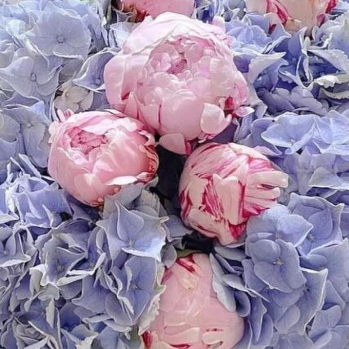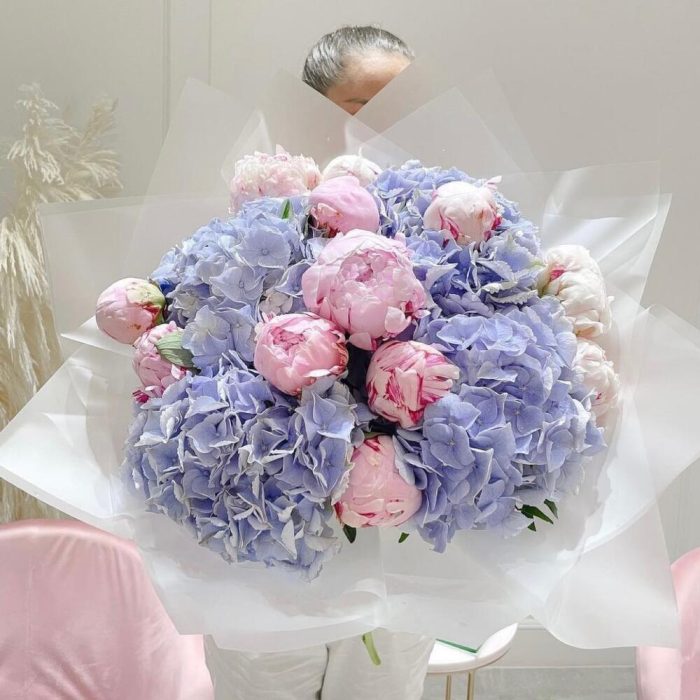 гортензии голубые – 4 шт.Пион розовый – 15 шт.Упаковка дизайнерская – 1 шт.Лента атласная – 2 шт.Открыточка с вашими пожеланиями – 1 шт.хорошее настроение – 100 шт.инструкция по уходу за цветами – 1 шт.коробка переноска – 1 шт.Кризал – 1 шт.