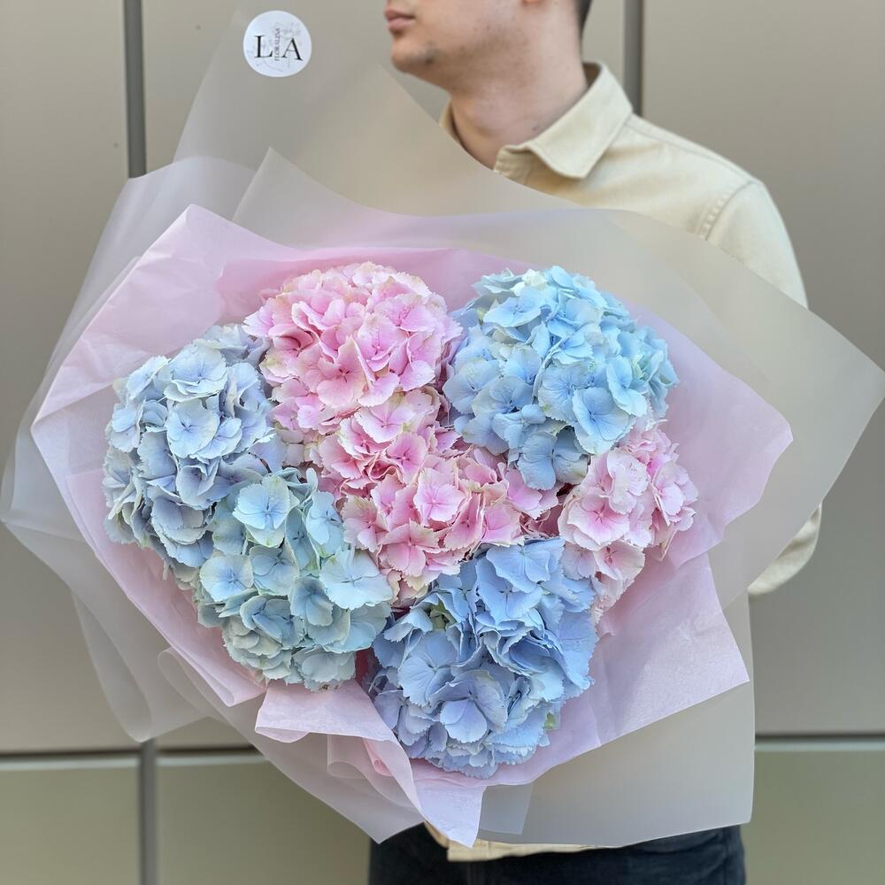 Нежное воздушное облако из микса гортензий Очень объемный букет в воздушной матовой полупрозрачной упаковке