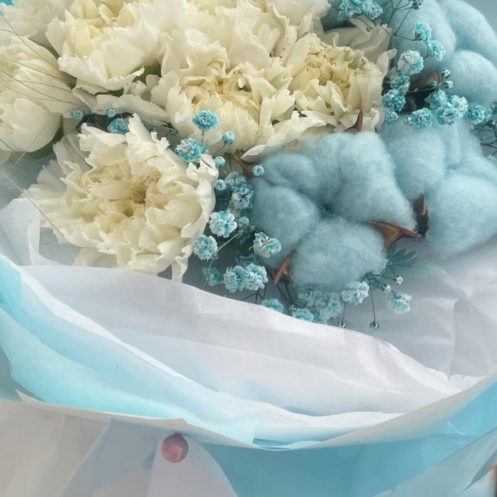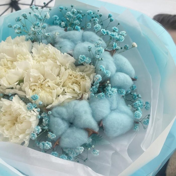 Гипсофила – 1 шт.Лента атласная – 2 шт.Тишью – 6 шт.Диантус – 9 шт.Пленка – 4 шт.Хлопок натуральный – 5 шт.стифа сухая – 5 шт.