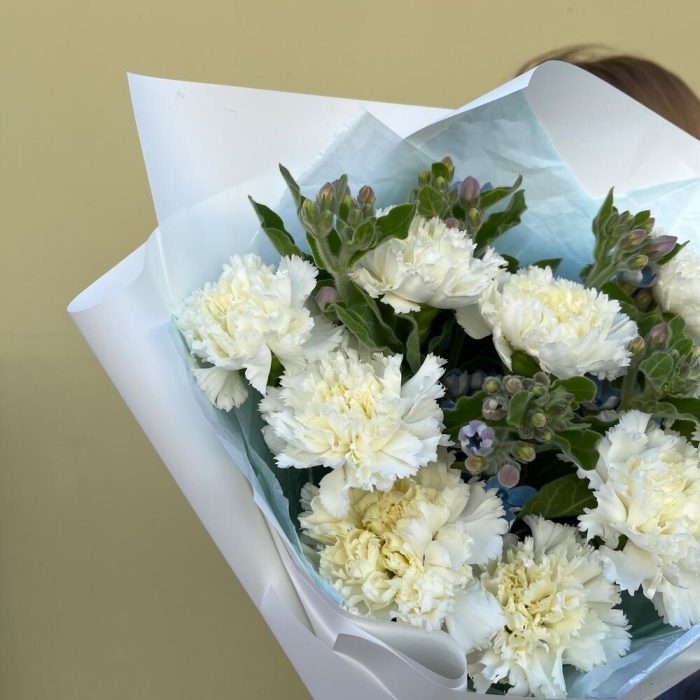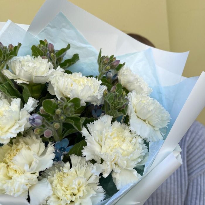 Лента атласная – 2 шт.Упаковка корейская пленка – 1 шт.тишью голубое – 1 шт.твидия голубая – 5 шт.диантус белоснежный – 9 шт.