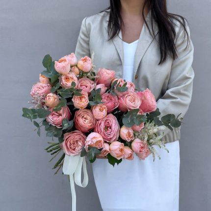 розы – 7 шт. Ранункулюс – 7 шт. Гвоздика – 3 шт. Астильба – 1 шт. Эвкалипт – 2 шт.