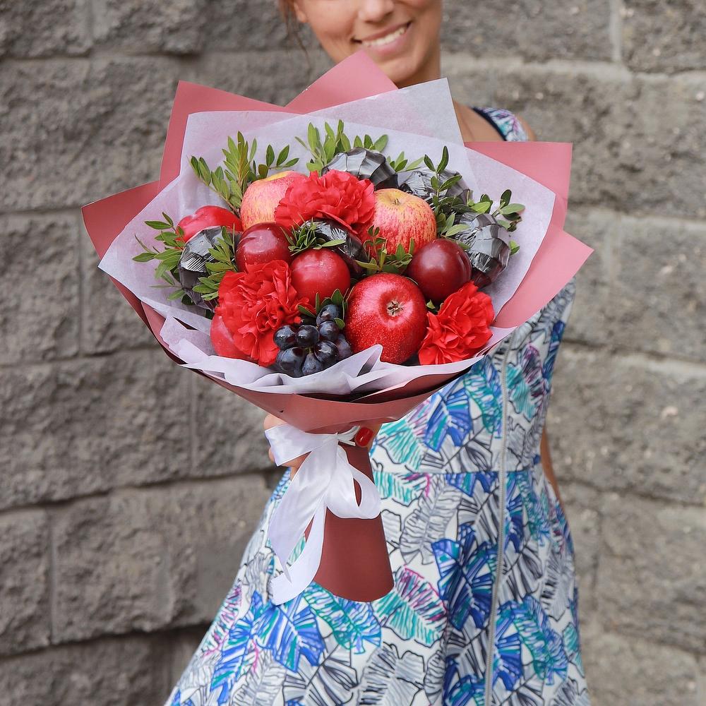 Яблоко – 3 шт.Виноград гроздь – 1 шт.Слива – 4 шт.Зефир в шоколаде – 5 шт.Гвоздика – 3 шт.