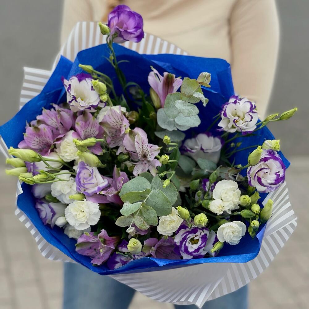 Эустома – 3 шт.Гвоздика кустовая – 3 шт.Эвкалипт – 1 шт.Упаковка дизайнерская – 2 шт.Лента – 1 шт.