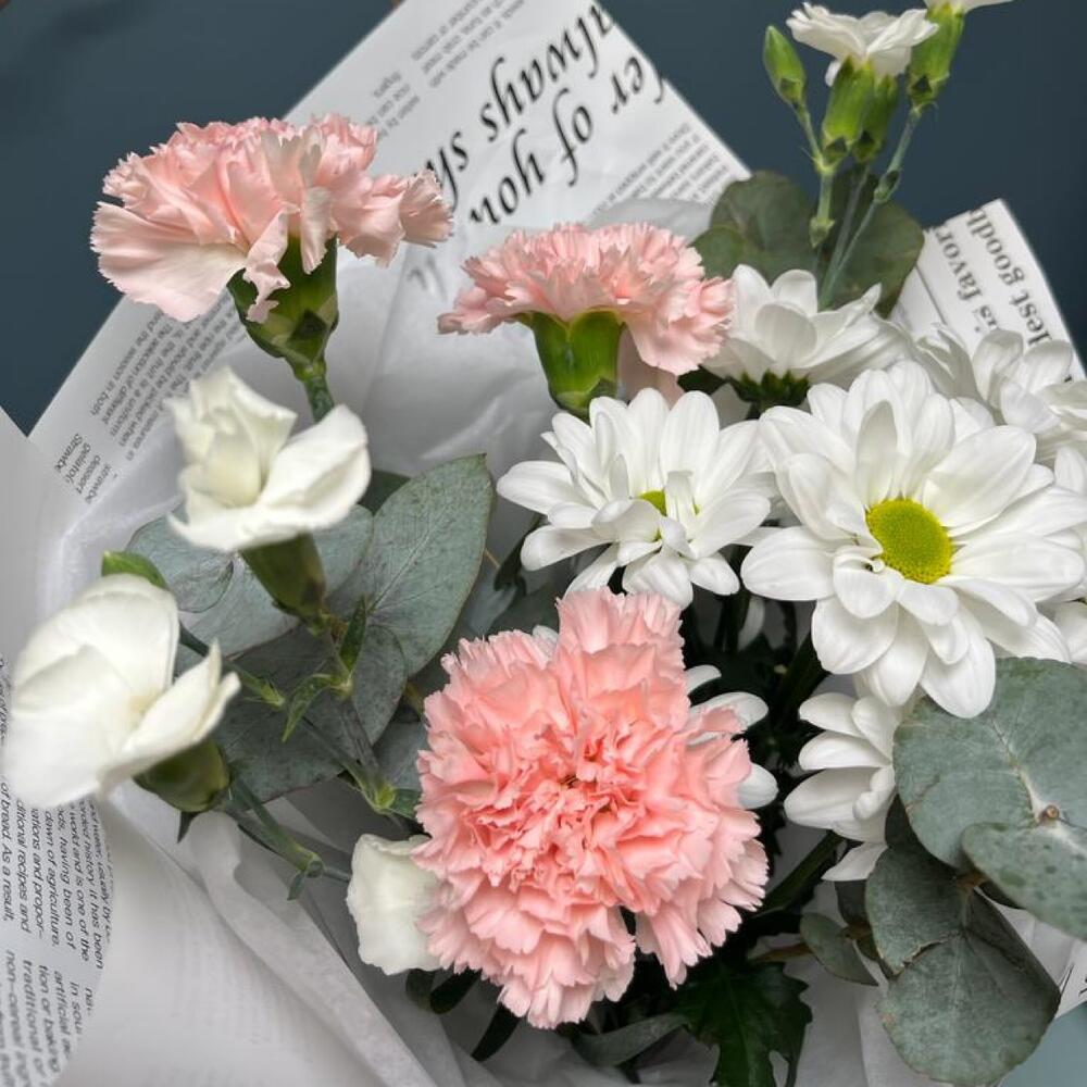 Букет «Нежность» с кустовыми гвоздиками, кустовой хризантемой и гвоздиками
