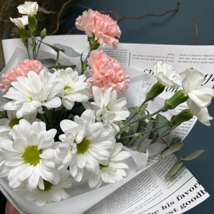 Эвкалипт – 3 шт.Кустовая хризантема – 1 шт.Гвоздика – 3 шт.Тишью – 1 шт.Кустовая гвоздика – 2 шт.Упаковка дизайнерская – 1 шт.