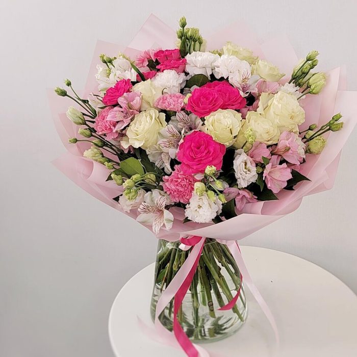 Альстромерия – 7 шт.Салал – 15 шт.Лента атласная – 10 шт.Роза кустовая пионовидная – 2 шт.Гвоздика сортовая – 7 шт.Упаковка дизайнерская – 8 шт.эустома белая – 5 шт.Роза одноголовая эквадор – 7 шт.