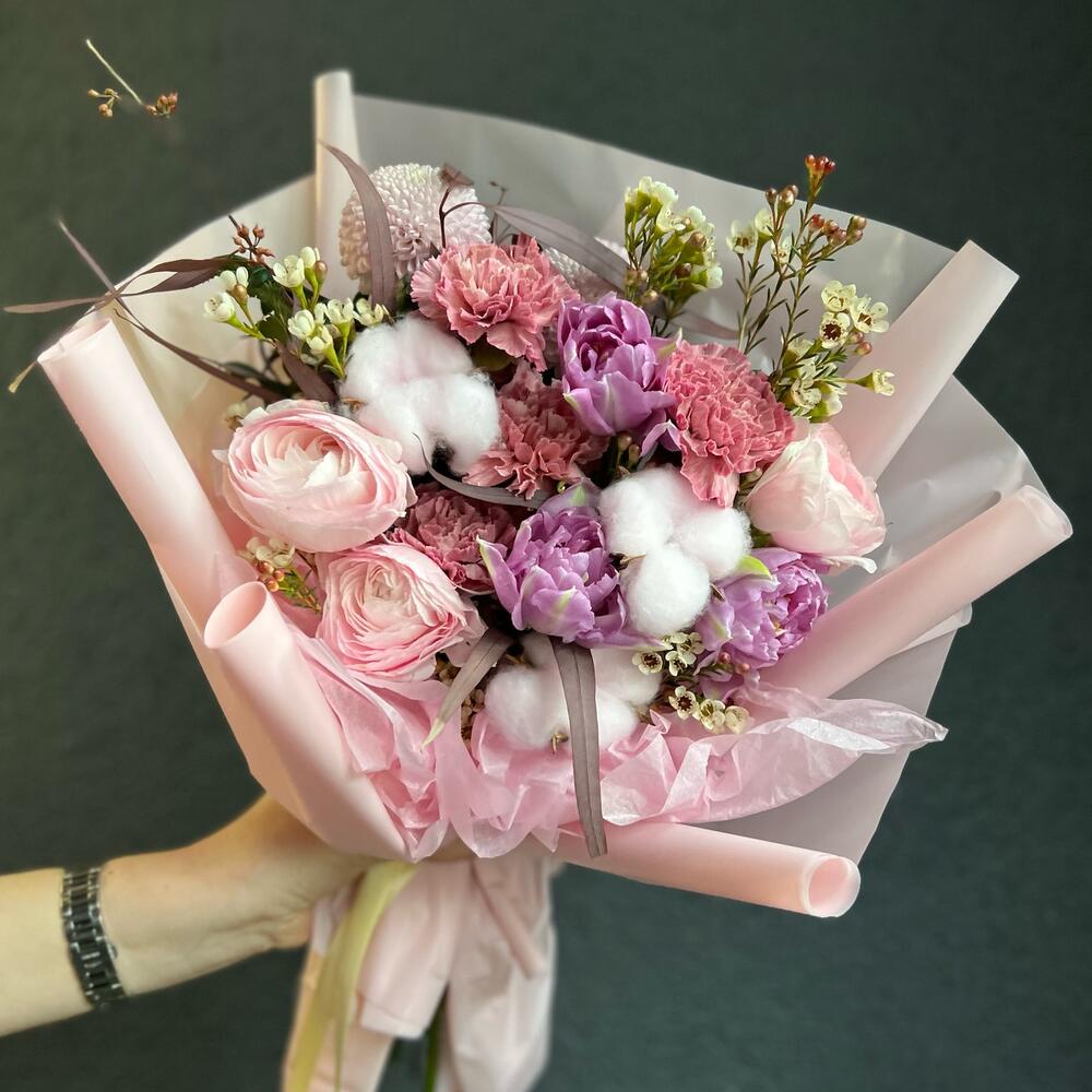 Ранункулюс – 3 шт.Хризантема одноголовая – 2 шт.Диантус – 4 шт.Тюльпан пионовидный – 3 шт.Хлопок (сухоцвет) – 3 шт.Хамелациум – 2 шт.Эвкалипт – 1 шт.Упаковка дизайнерская – 2 шт.Лента атласная – 1 шт.
