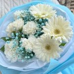 Гербера белая – 3 шт.Гвоздика белая – 5 шт.Салал листья – 5 шт.Гипсофила – 2 шт.Пленка матовая – 4 шт.Тишью – 4 шт.
