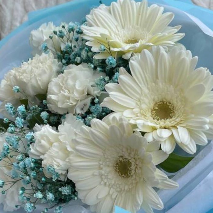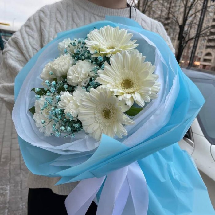 Гербера белая – 3 шт.Гвоздика белая – 5 шт.Салал листья – 5 шт.Гипсофила – 2 шт.Пленка матовая – 4 шт.Тишью – 4 шт.