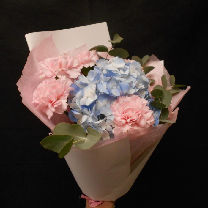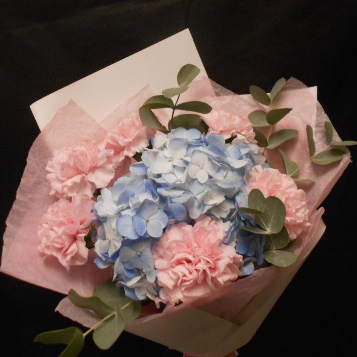 Гортензия голубая с гвоздиками и эвкалиптом