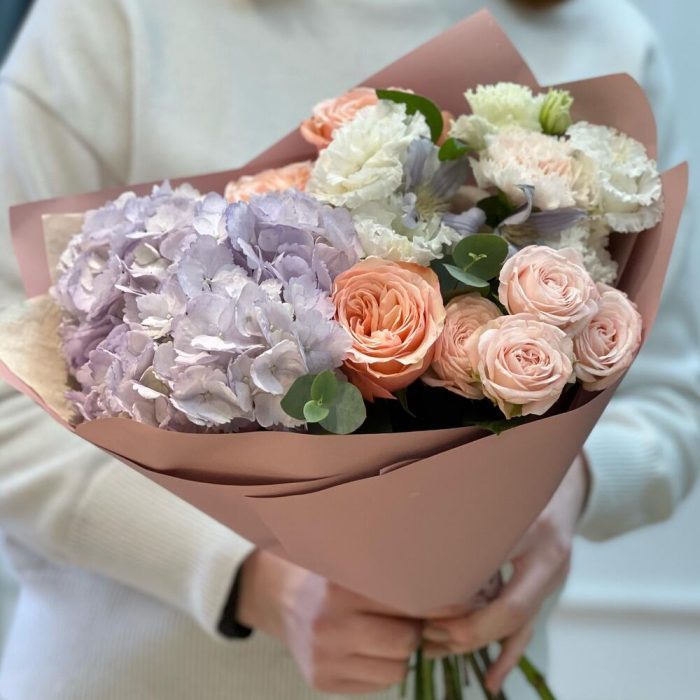 Красивый букет с гортензией и пионовидными розами «Чувствуя тебя»