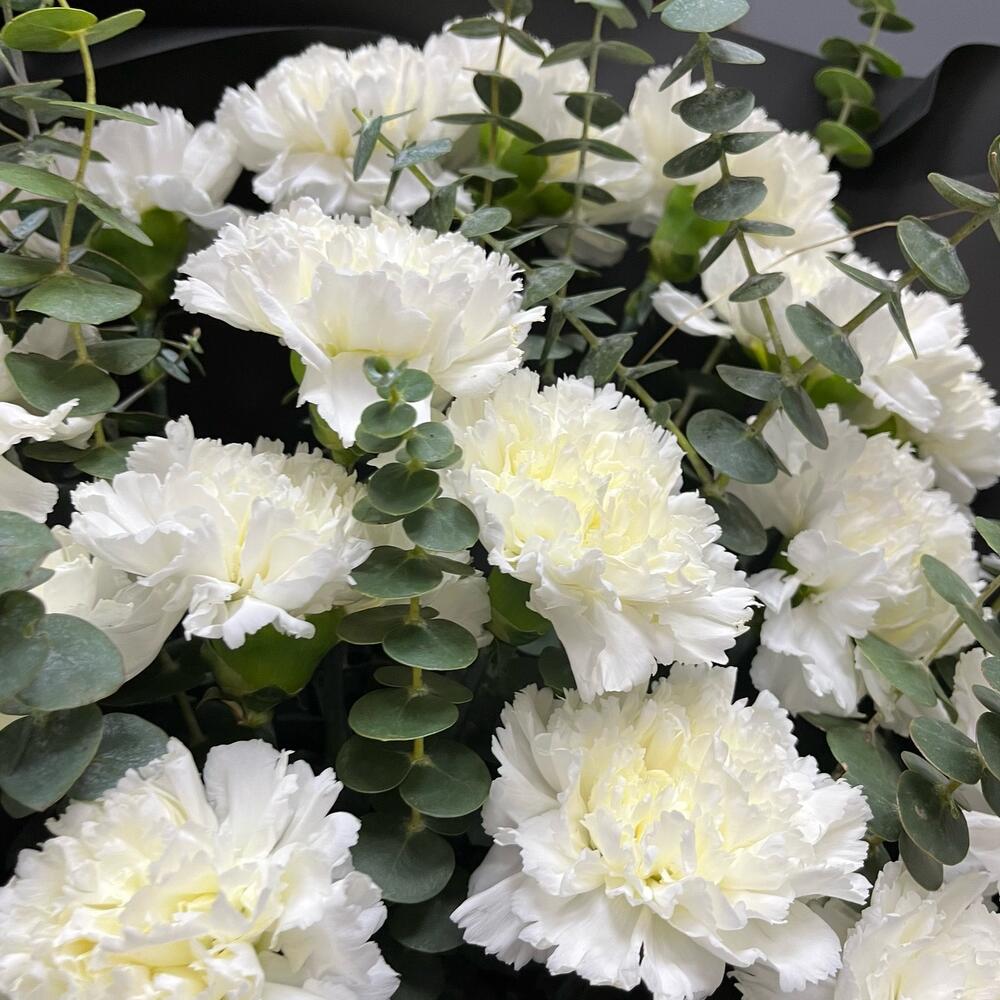 Малефисента креативный премиум монобукет из 19 белоснежных диантусов с эвкалиптом
