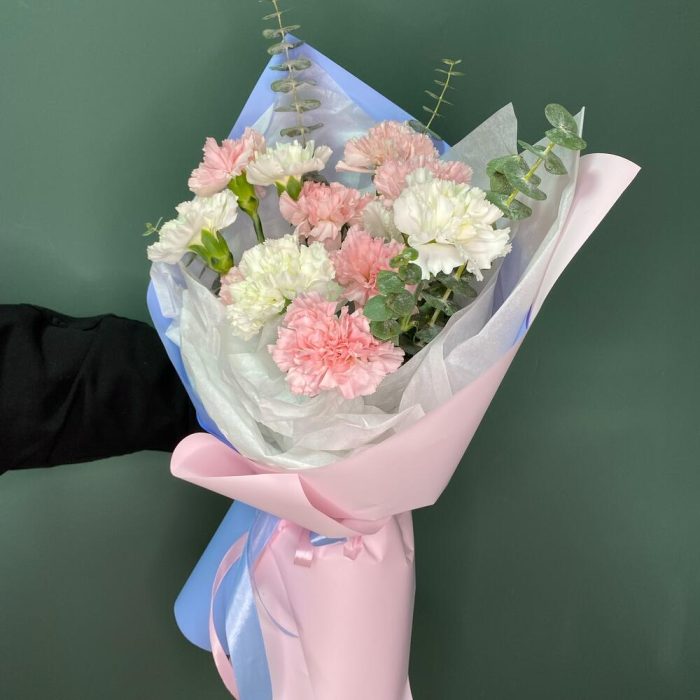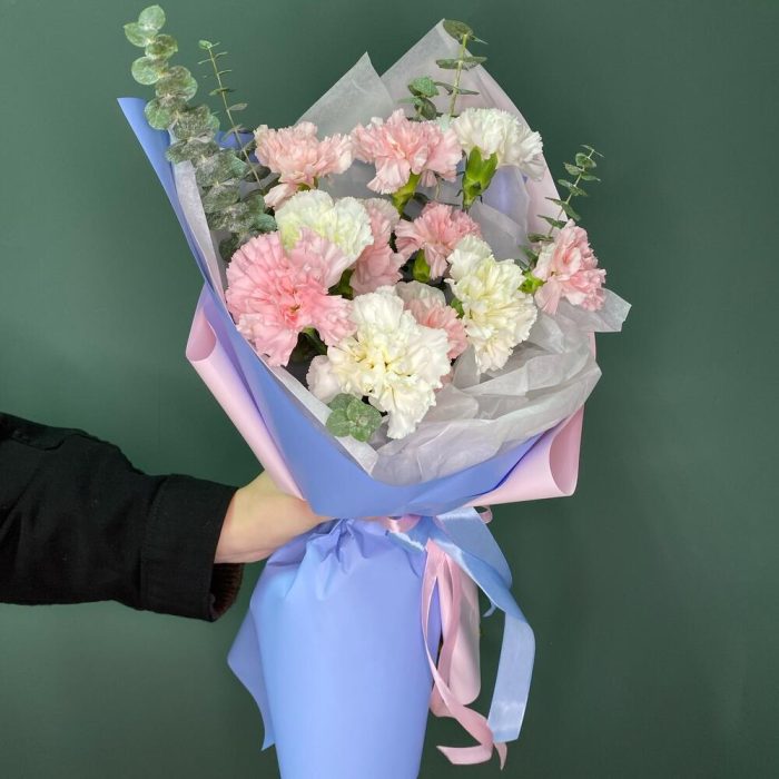 Диантус сортовой – 13 шт.Зелень – 2 шт.Упаковка дизайнерская – 1 шт.Открытка мини – 1 шт.уходовое средство для цветов – 1 шт.Аквабокс – 1 шт.транспортировочная упаковка – 1 шт.