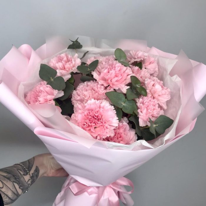 Нежно-розовой букет с диантусом и эвкалиптом