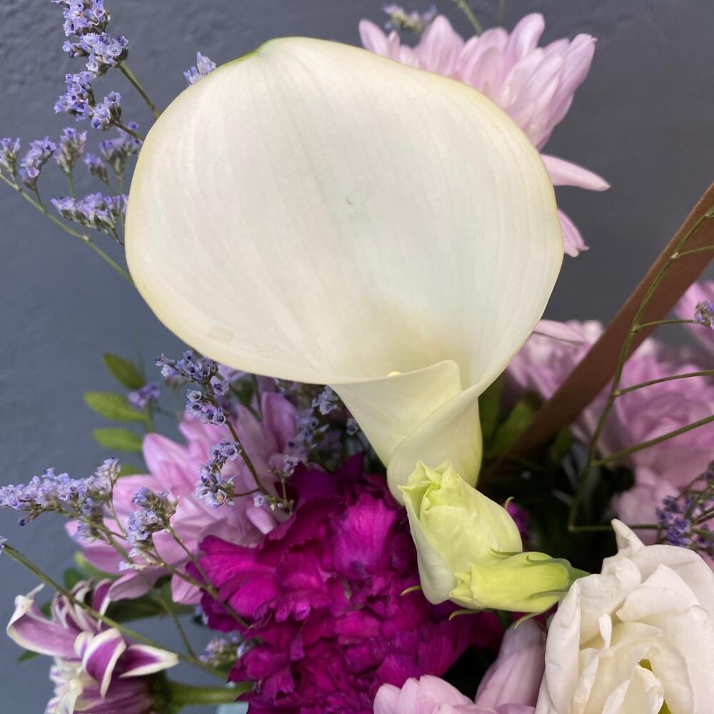 Хризантема кустовая – 2 шт.Эустома – 2 шт.Лента атласная – 1 шт.Диантус – 3 шт.Фисташка – 1 шт.Сумочка – 1 шт.Лимониум сиреневый – 2 шт.Оазис флористический – 1 шт.