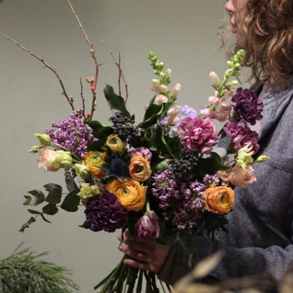 Ранункулюс – 5 шт.Тюльпан – 3 шт.Сирень – 2 шт.Гвоздика – 5 шт.Плющ – 2 шт.айва ветка – 1 шт.колючки ветка – 1 шт.Эвкалипт – 5 шт.Лизиантус – 2 шт.Лента – 1 шт.