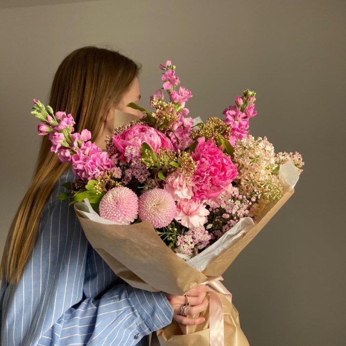 Авторский букет с сиренью, пионами, сортовыми хризантемами, маттиолой, восковым миртом, гвоздиками и вибурнумом.