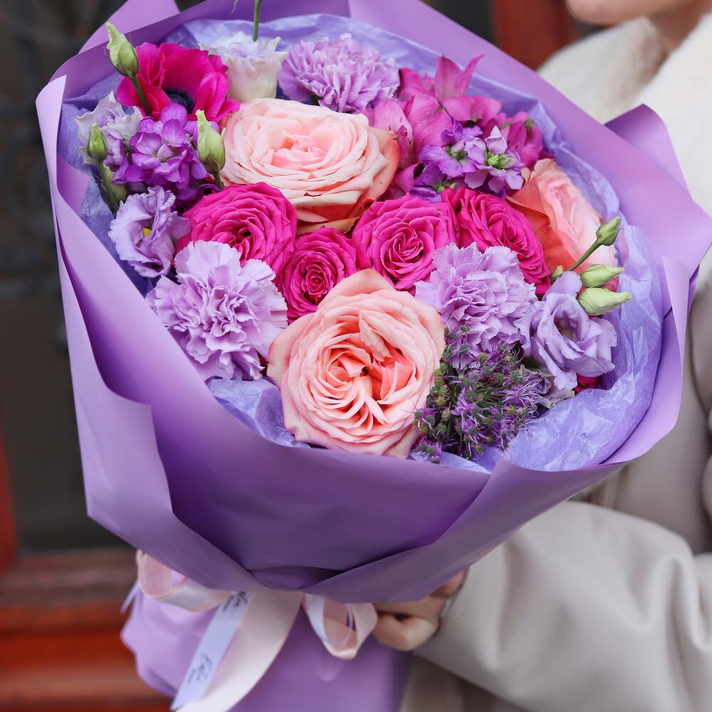 Яркий, насыщенный, желанный букет из пионовидных роз, лизиантуса, кустовых роз и ароматной маттиолы.Этот букет удивит своей красочностью и стойкостью и подойдёт под любой повод.Он будет идеальным сюрпризом для яркой, экстравагнатной леди.В подарок к букету шоколадка для прекрасной получательницыМы также можем отправить вместе с букетом конфеты, шоколад ручной работы или б/а вино по вашим пожеланиям, просто напишите нам в личные сообщенияПредоставляем исключительный сервис и заботу о клиенте