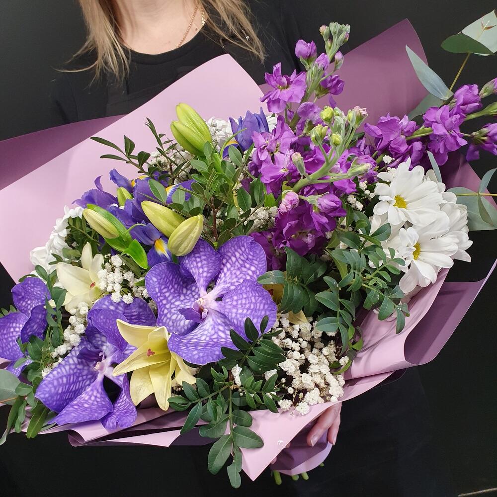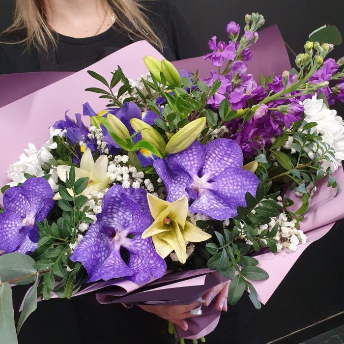Азиатская лилия – 2 шт.Ирис – 3 шт.Гипсофила – 2 шт.Хризантема кустовая – 3 шт.Орхидея Ванда – 3 шт.Маттиола – 3 шт.Эвкалипт – 2 шт.Фисташка – 6 шт.Упаковка дизайнерская – 2 шт.