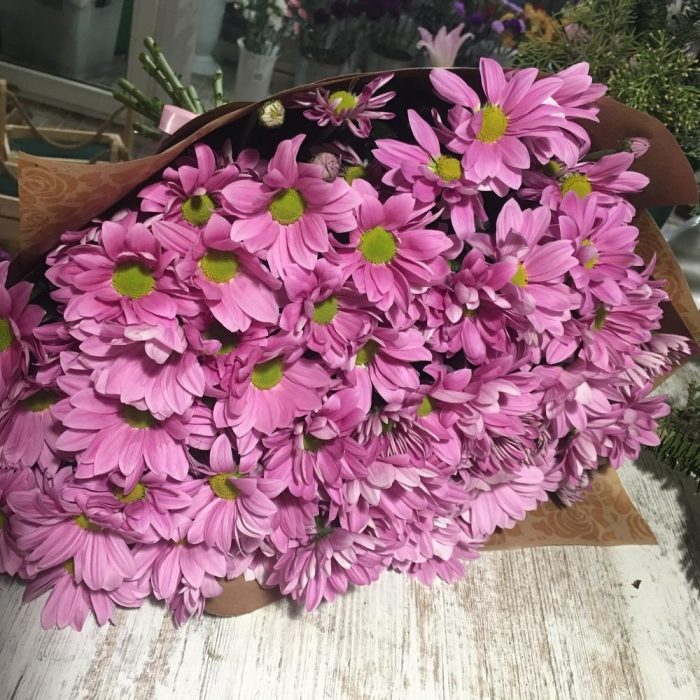 Кустовая хризантема – 11 шт.Лента атласная – 1 шт.Крафт упаковка – 1 шт.