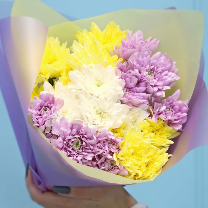 Букет из 5 кустовых хризантем Балтика микс в стильной упаковке