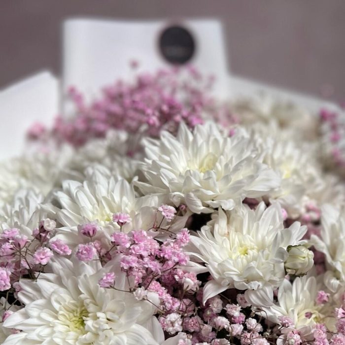 Кустовая хризантема – 11 шт.Атласная лента – 1 шт.Гипсофила розовая – 5 шт.декоративная упаковка – 1 шт.