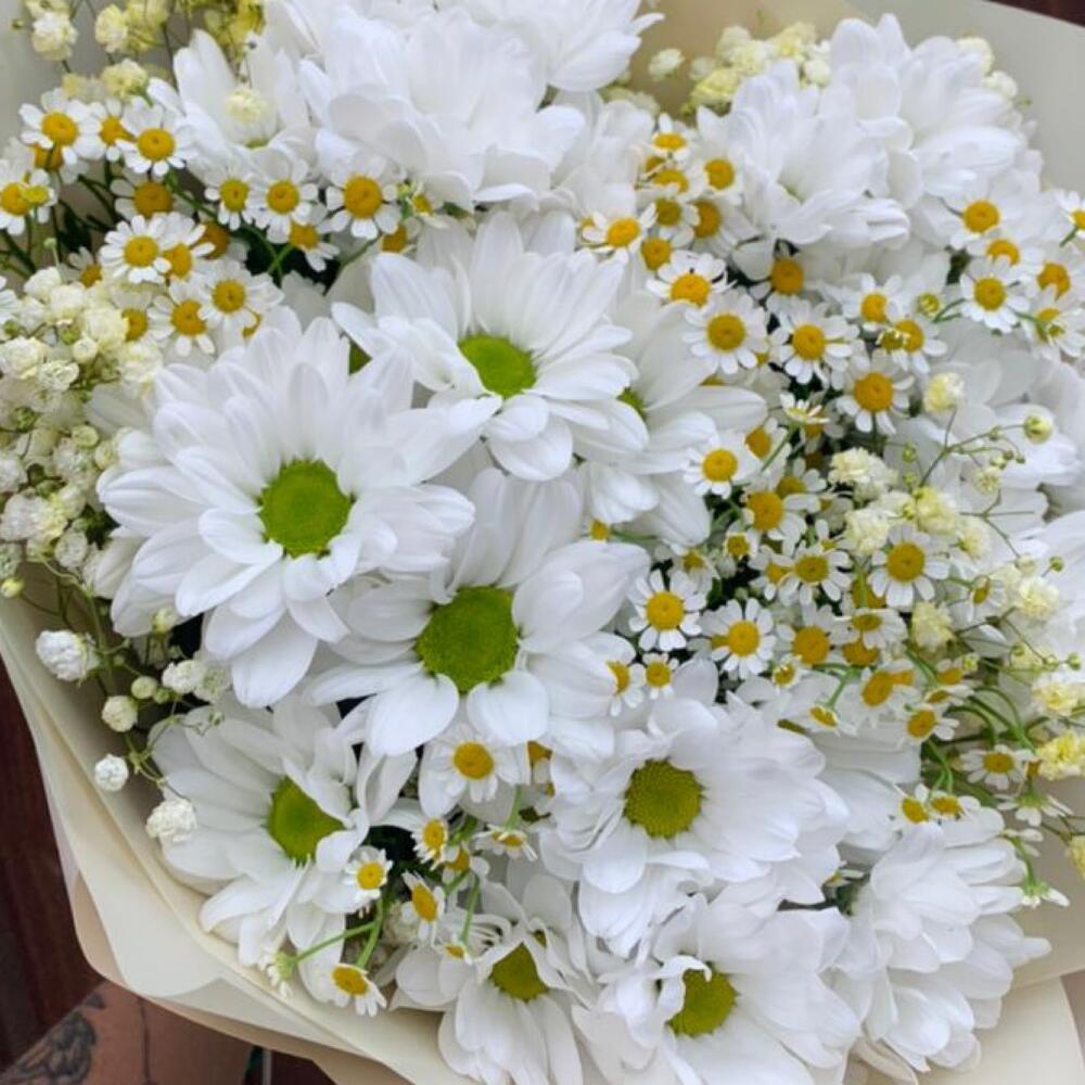 Хризантема кустовая – 5 шт.Матрикария (Ромашка Камила) – 5 шт.Гипсофила – 3 шт.Упаковка дизайнерская – 2 шт.Лента атласная – 2 шт.
