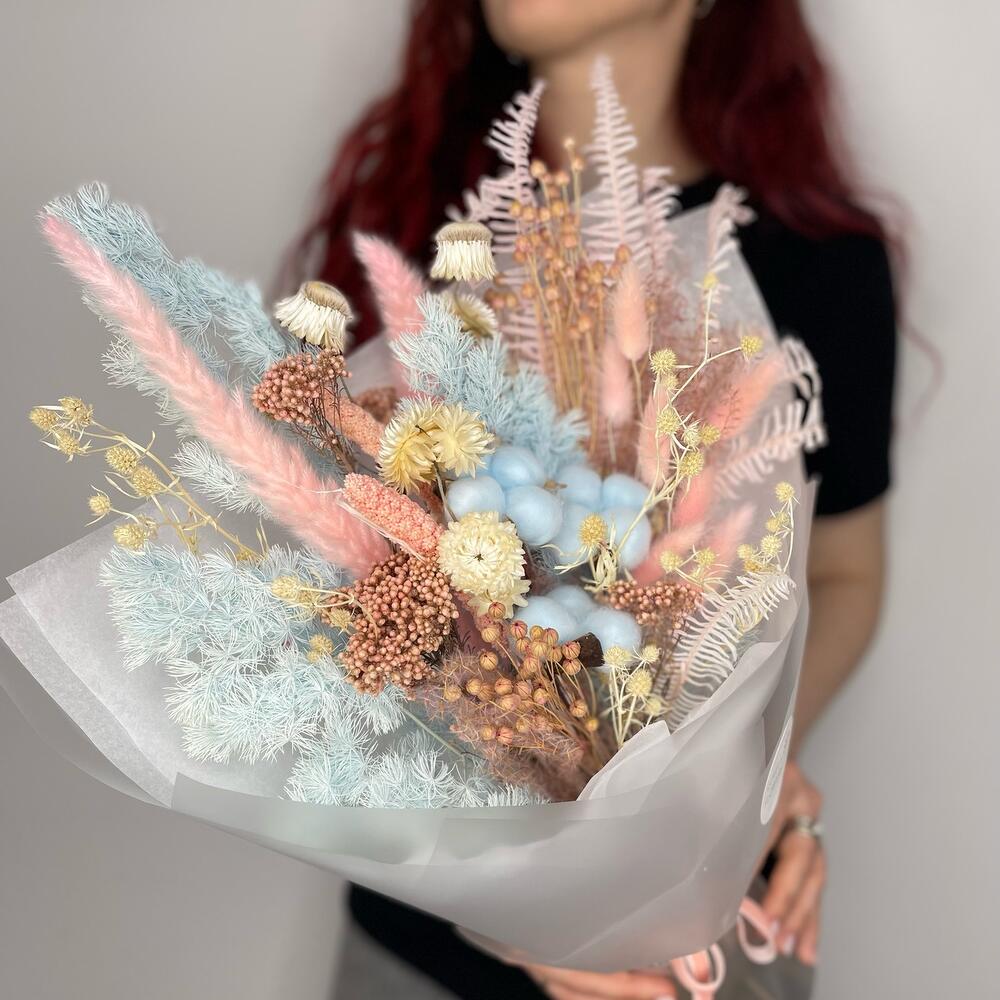 хлопок цветной – 3 шт.аспарагус стабилизированный – 1 шт.папоротник стабилизированный – 1 шт.гелихризум (сухоцвет) – 5 шт.озотамнус стабилизированный – 1 шт.лен сухоцвет – 9 шт.эрингиум сухоцвет – 2 шт.Лагурус (сухоцвет) – 7 шт.камыш сухоцвет – 2 шт.мискантус сухоцвет – 2 шт.сетария сухоцвет – 2 шт.Упаковка дизайнерская – 1 шт.Лента бархатная – 1 шт.