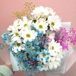 Лента – 1 шт.Хризантема кустовая – 3 шт.Упаковка – 1 шт.гипсофила радужная – 3 шт.