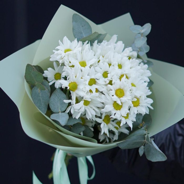 Хризантема кустовая – 9 шт. Эвкалипт – 5 шт. Упаковка дизайнерская – 2 шт. Открыточка с вашими пожеланиями – 1 шт. инструкция по уходу за цветами – 1 шт.