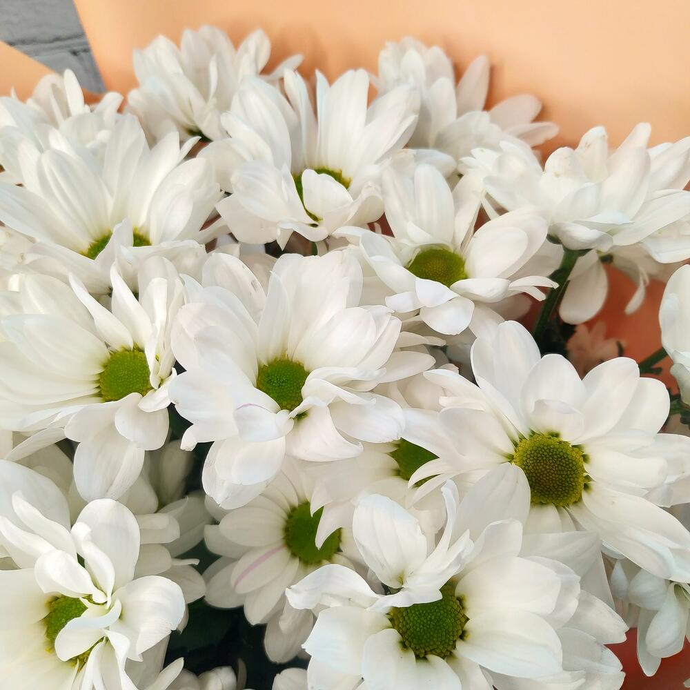Прекрасный букет из белых хризантем, станет идеальным подарком для самых любимых и близких!Памятка для букета:1. Чистая вода раз в сутки.2. Стебли подрезаем на 0,5см при каждой смене воды.3. Ставим в прохладное место, но не у окна.4. Чтобы вода оставалась свежей, не допускайте попадания листьев и лепестков в воду.Друзья, обратите внимание, что цвет упаковки может быть другим, в зависимости от наличия на складе.