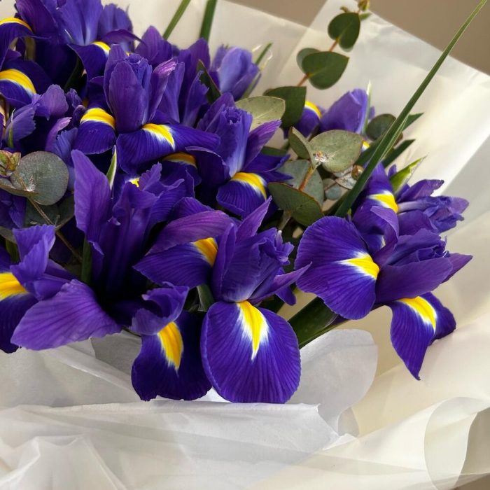 Ирис – 15 шт.Эвкалипт – 2 шт.Лента атласная – 1 шт.Упаковка дизайнерская – 2 шт.
